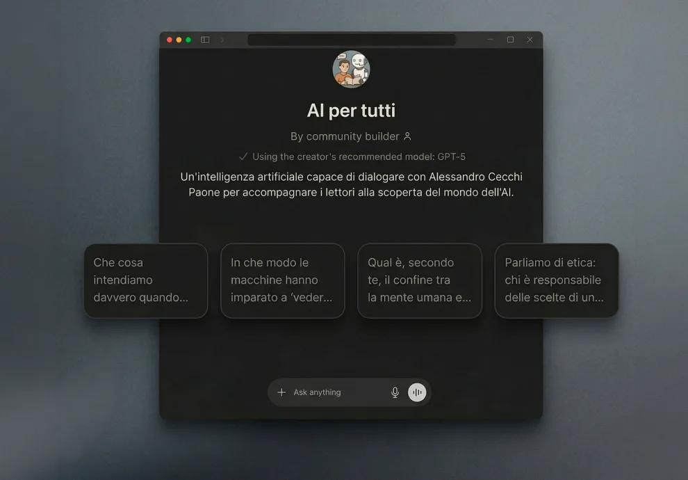 La loro conversazione è protagonista del nuovo libro di Cecchi Paone “AI per tutti. Un dialogo diretto con l’intelligenza artificiale per capire cos’è, come funziona e dove ci porterà”. L’obiettivo era chiaro: trasformare l’AI da un concetto astratto a un interlocutore capace di guidare l’autore, e di conseguenza il lettore, alla scoperta dell’intelligenza artificiale.